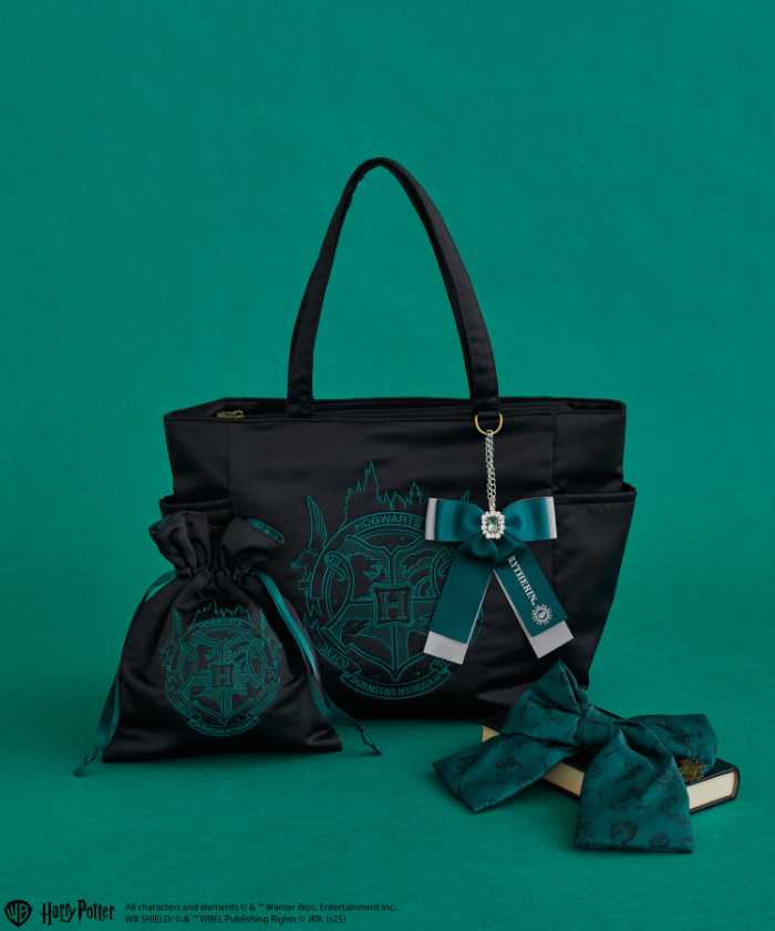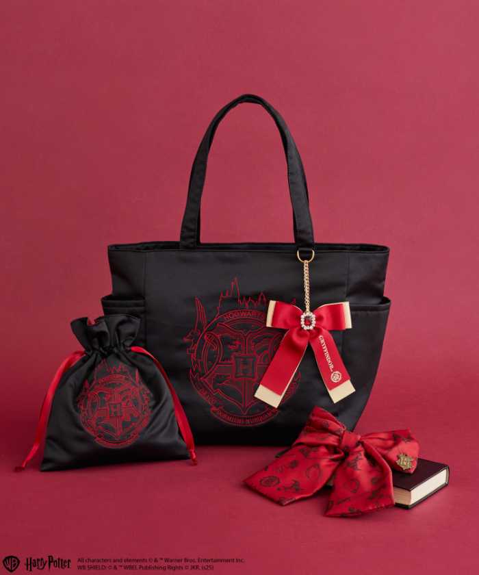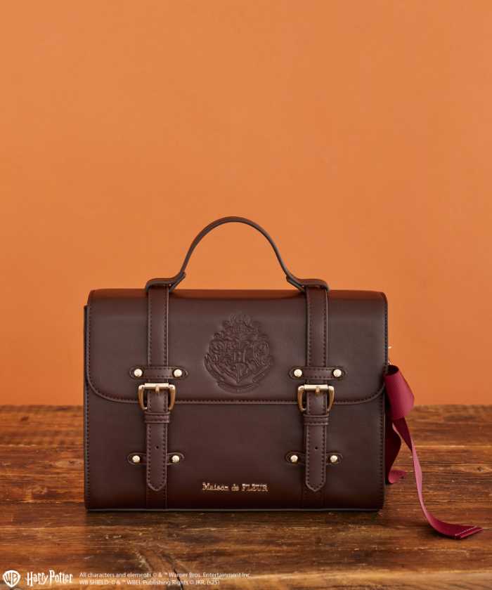 コレクションの目玉は、フロントにホグワーツの紋章が刻まれたサッチェルバッグ(¥14,300/Dark Brown)。大きめのグログランリボンが上品なアクセントになり、トラッドな装いとも好相性。