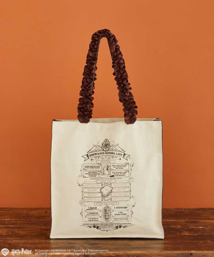 スクエア型のフリルトート(¥7,300/Beige)は、ホグワーツ入学準備リストのアートがポイント。