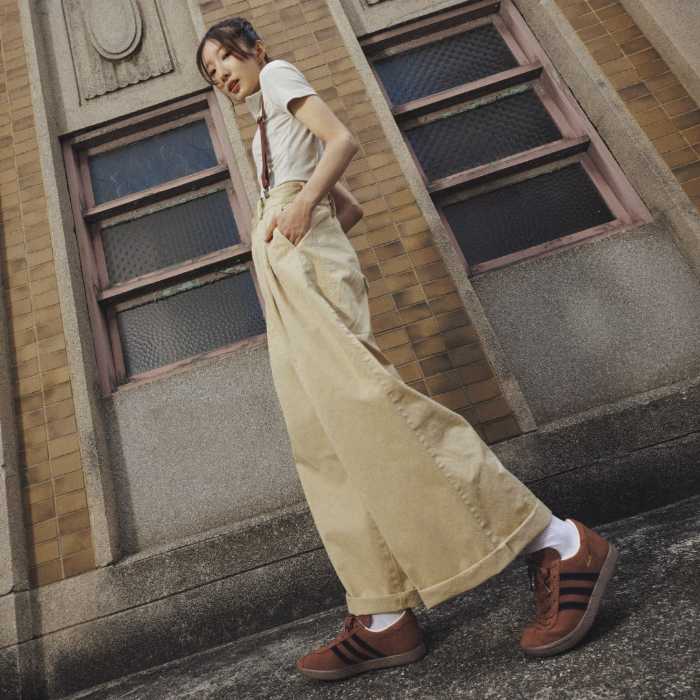 クロップドトップスにチノパン×サスペンダーのマニッシュスタイル。ブラウンの「STADT」で深みある足元に。