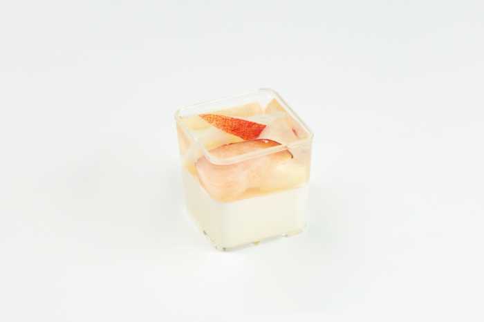 バニラアイスやぷるぷるのゼリー、カット桃などが層になっており、一口ごとに異なる食感と風味を楽しめます。