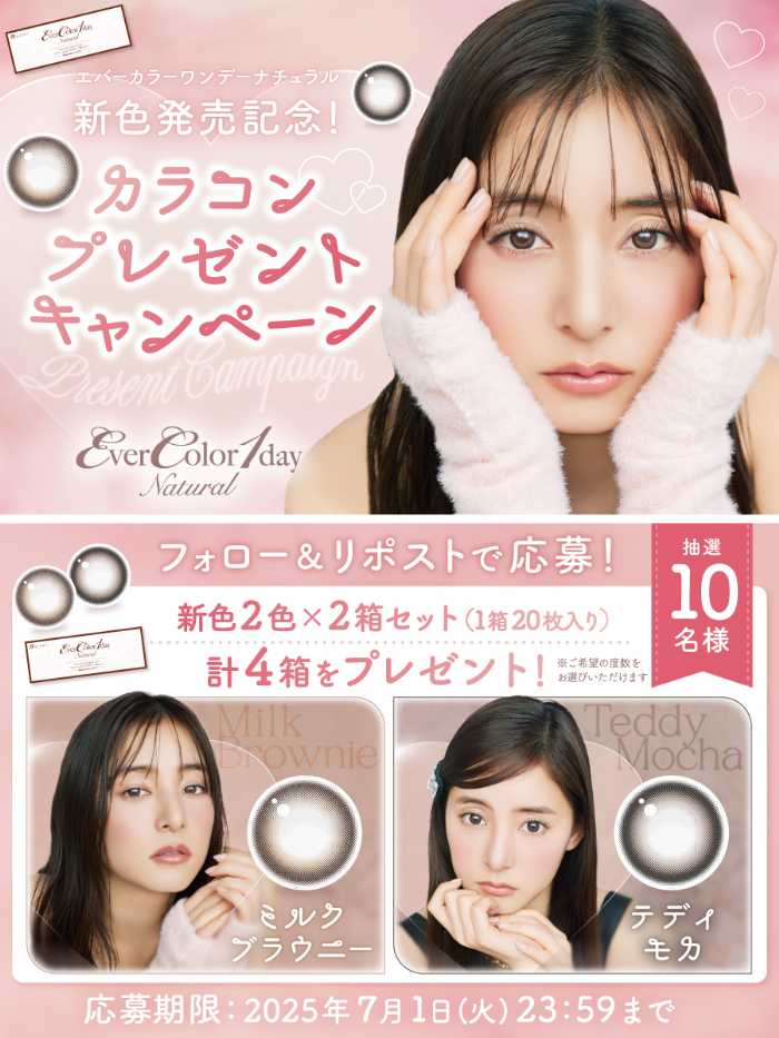 “誰でも使いやすくて、ナチュラルに盛れる”と人気のカラコンブランド『エバーカラーワンデーナチュラル』から、注目の新色「ミルクブラウニー」と「テディモカ」が登場♡甘くて色っぽい「大人のバブみ」を叶える2つのブラウンカラーで、まるで生まれつきのようなちゅるんとした愛され瞳に。瞳にさりげなくときめきを仕込む新色で、メイクがもっと楽しくなりそう♪