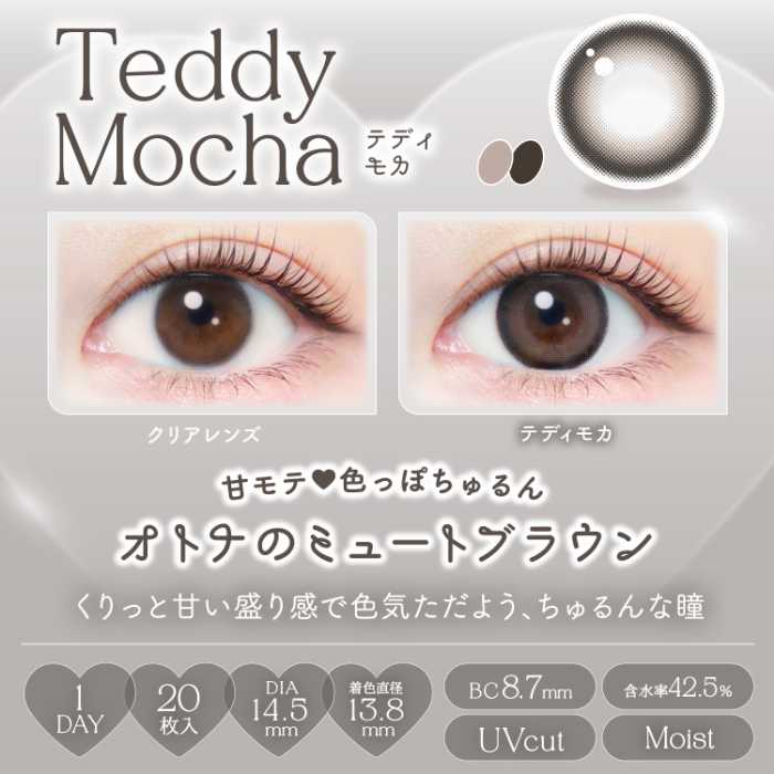 一方「テディモカ」は、深みのあるミュートブラウンが特徴。くりっとしたフチと絶妙なコントラストで、ほんのり色気を漂わせる大人かわいい仕上がりに。
