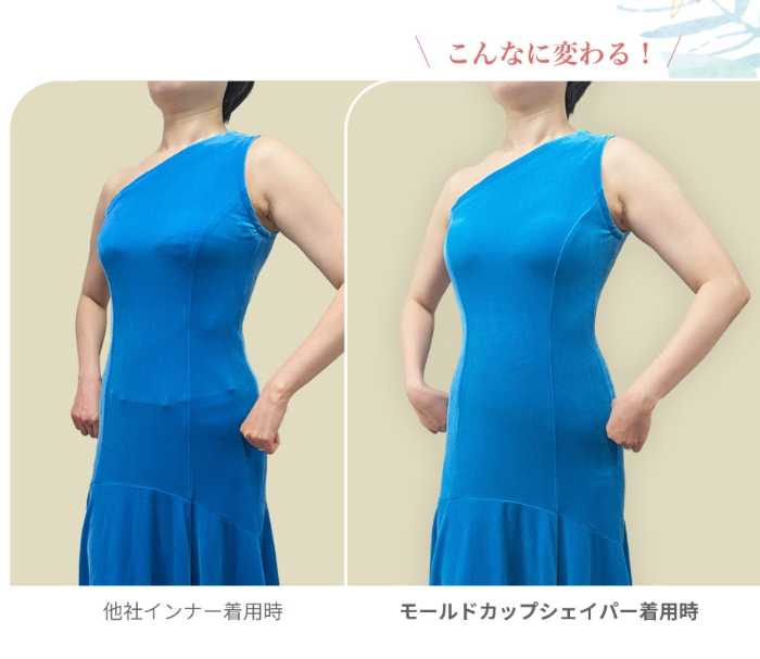 「モールドカップシェイパー」は、縫い目のないモールドカップを採用することで、フラ衣装へのライン響きを最小限に。ベロアや薄手ドレスにも自然に馴染み、バストの横広がりを抑えて中央に美しく寄せる構造に。