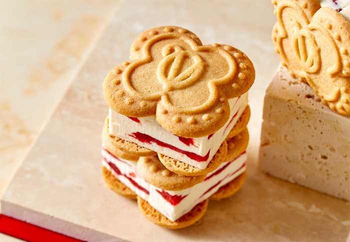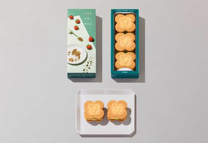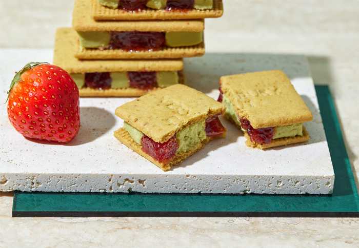 苺「サンアンドレアス種」の果肉を煮込んで作られた甘酸っぱいコンフィチュールに、濃厚ローストピスタチオバターを合わせ、発酵バター香るクッキーでサンド。