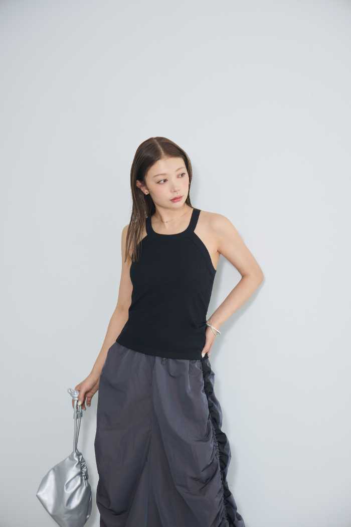 一方、『ホルターネック タンクトップ』は、デコルテや肩まわりを上品にカバーしつつ、トレンド感あるヘルシーな肌見せを実現。