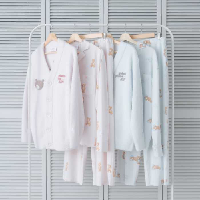 ふんわりハートを抱えたJIN’s BEARが並ぶシャツ&ロングパンツは、コーディネートのアクセントに♡