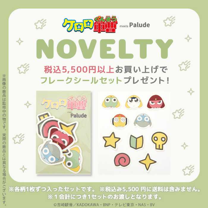 さらに、アニメ『ケロロ軍曹』のアイテムを5,500円(税込)以上購入した方には、「フレークシールセット」がノベルティとしてプレゼントされます(※送料除く、1会計1点限り)。