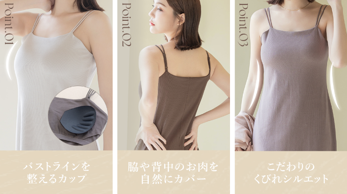 《2wayリブカップ付きワンピース》は、tu-hacci独自のノンワイヤーカップを採用。自然な美胸を叶えるだけでなく、バストの横広がりを防いで中央に集める設計になっています。
