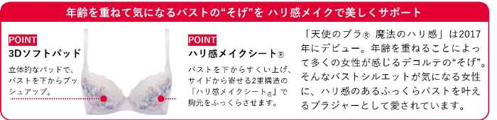 新作「天使のブラⓇ 魔法のハリ感」は、ヨルガオとチューベローズをモチーフにした繊細なレースと、3Dパッド×ハリ感メイクシートⓇを組み合わせることで、自然なふっくら感を実現。