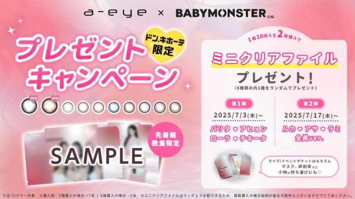 a-eye対象商品を2箱購入ごとに、BABYMONSTERの限定ミニクリアファイル(全8種)をランダムで1枚プレゼント。