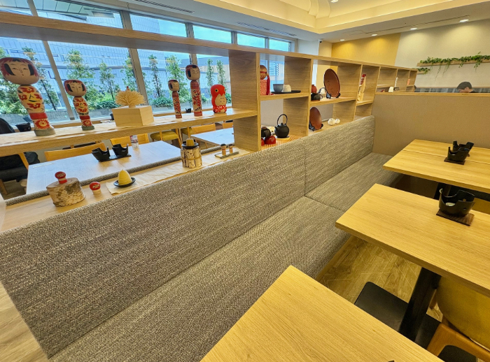 江戸時代後期頃から、東北地方の温泉地において湯治客に土産物として売られたとされる伝統工芸品「こけし」(ろくろ挽きの木製の人形玩具)や、地元の特産品が客席に飾られていて、郷土感があふれた空間。