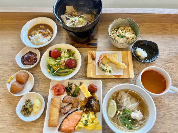 スクランブルエッグ•揚げ春巻•焼き鮭といった和洋中の定番総菜や、サラダバーはもちろん、芋煮やラーメンの鳥中華、玉こんにゃくといった郷土料理に、揚げたての天ぷらまで付きます。