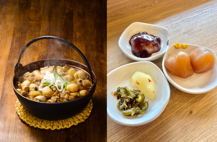 左は芋煮鍋イメージ(写真:リッチモンドホテル山形駅前)、右は玉こんにゃく、あんこ餅、五月雨漬け、紅花入り大根酢漬け