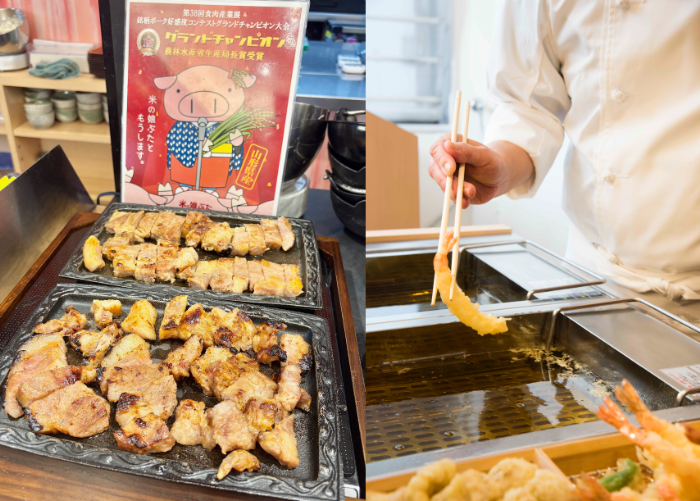 「米の娘ぶた」の西京味噌ステーキ、天ぷら3種は揚げたて(右写真:リッチモンドホテル山形駅