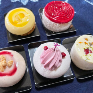 ・郷土のお漬物:紅花入り大根酢漬け、さくらんぼ漬け、おみ漬け、ピリ辛青菜(せいさい)漬けなど。取材時は山形・大石田の老舗よりお取り寄せした五月雨漬け(きゅうり•わらび•大根など)も味わえました。月2回程度、内容の入れ替えがあり、期間限定のものも。山形でしか味わえない地元のお漬物が豊富で、白飯が進みます。