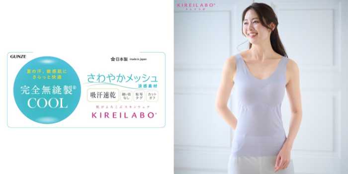 汗ばむ季節にうれしい「GUNZE キレイラボ」シリーズからは、夏向けの2タイプのカップ付きインナーが登場!通気性抜群の「さわやかメッシュ」は吸水速乾でムレ知らず。