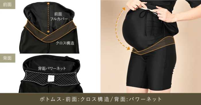 ボトムスはフルカバータイプで、パワーネットのクロス構造が程よいフィット感とサポート力を発揮します。トップスのフロントファスナーは授乳もしやすい深め設計で、ママにうれしい機能が満載♡