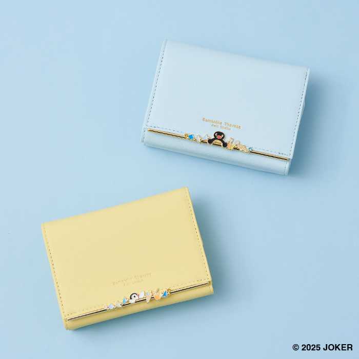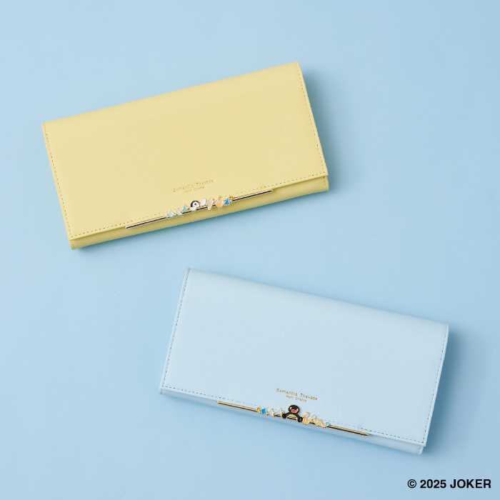 ペールイエローとライトブルーの2色展開で登場した折財布&長財布には、ピングーとピンガの何気ない日常を切り取った遊び心たっぷりの金具バーが♡