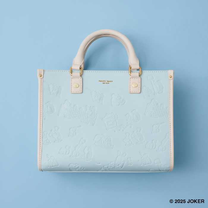 アイスブルーが爽やかなハンドバッグは、ポーチとおそろいの総柄アートを型押しにして上品に仕上げた大人可愛い一品。持ち手の付け根には、PINGUの顔をデザインした金具がさりげなくきらめきます♡