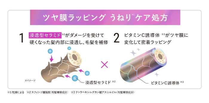 そこでQurapは、髪の柔軟性を支える「CMC」に着目し、浸透型セラミドとビタミンC誘導体を独自配合した「ツヤ膜ラッピングうねりケア処方」を開発。