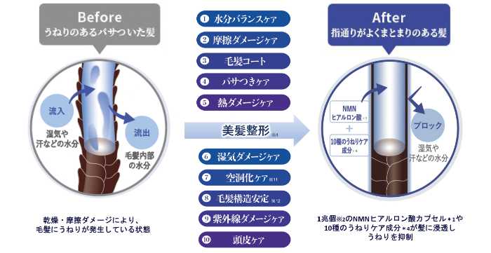 美容液成分90%以上の贅沢処方で、髪の内部までうるおいが浸透し、寝ている間にしっとりまとまる髪へ。さらに、摩擦や湿気、紫外線など10種のうねりの原因に全方位からアプローチ。