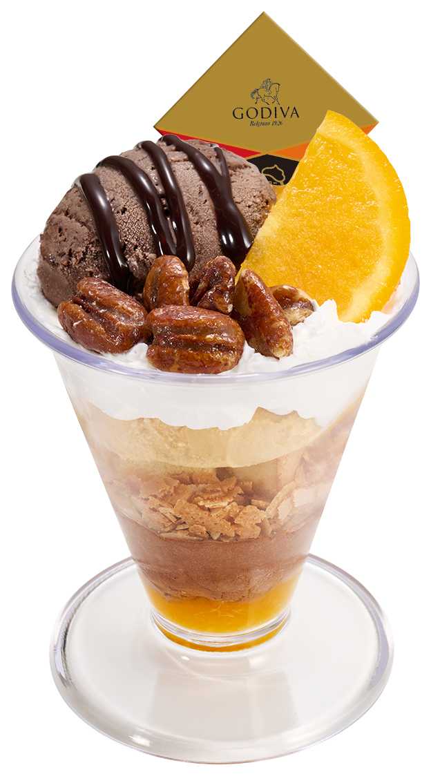 「オランジュショコラナッツパフェ」は、複雑な層の美味しさにうっとり♡ビターチョコチップ入りチョコアイスにキャラメルアイス、濃厚ムースを重ね、オレンジ&チョコソースが華やかさをプラス。