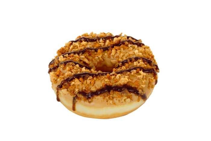 キャラメルコートに包まれたドーナツに、アーモンドとベーコン風味のクランチをトッピング。最後に“味の決め手”として、甘じょっぱいみそだれをとろりとかけて仕上げました。