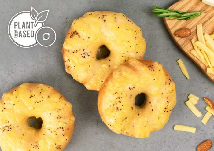 「プラントベースチーズとペッパー」(268円)は、しっとりもちもちのプレーンベーグルに、植物性チーズとブラックペッパーをトッピングした大人向けフレーバー。