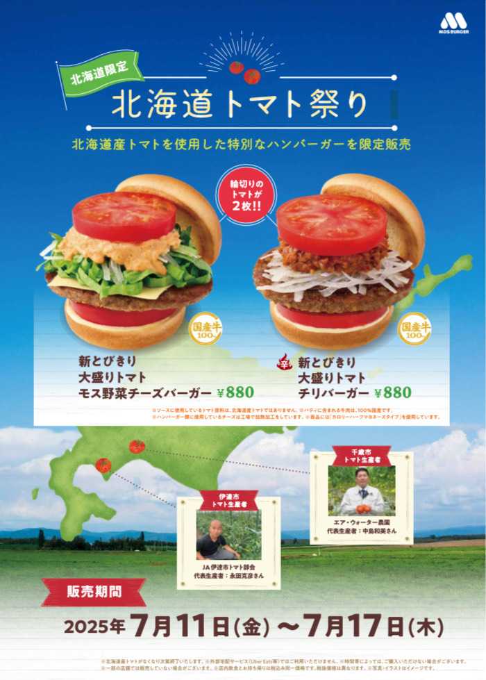 今年の夏、モスバーガーで“北海道の恵み”を丸ごと味わってみませんか?7月11日(金)〜17日(木)の7日間限定で、北海道内のモスバーガー店舗では「北海道トマト祭り」が3年ぶりに開催。みずみずしい北海道産トマトを使用したハンバーガーは、この期間だけの特別な味わい♡地元契約農家で育まれた新鮮なトマトと国産牛パティの贅沢な組み合わせを、ぜひこの機会に楽しんで!