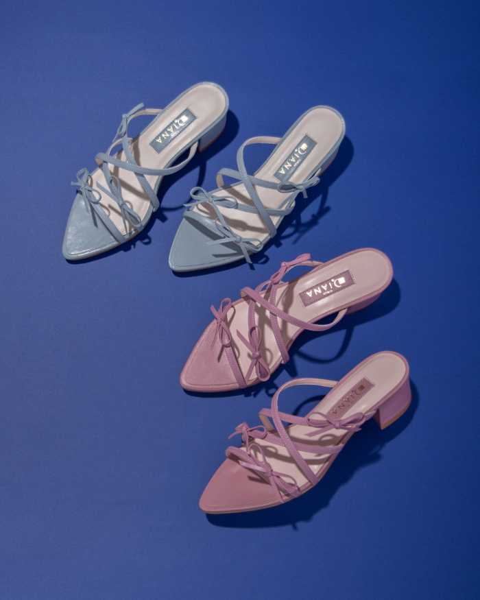 今季のバレエコアトレンドに寄り添う、ダイアナのWEB限定ストリングミュール。ライトオーキッドとミルキーブルーは、数量限定&公式通販サイト限定での展開です。