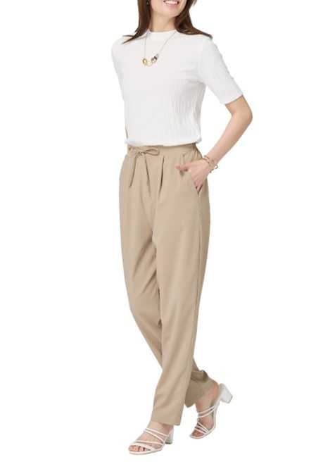 シルエットの美しさが魅力の「接触冷感すっきりイージーパンツ」は、ウエスト紐でサイズ調整可能なラクチン仕様。