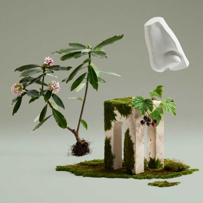 庭園内の苔むした倒木の隙間に咲くダフネ(沈丁花)を主役に、ブラックカラントリーフやモス、ベチバーが調和し、幻想的なフローラルアロマティックの香りに仕上がっています。