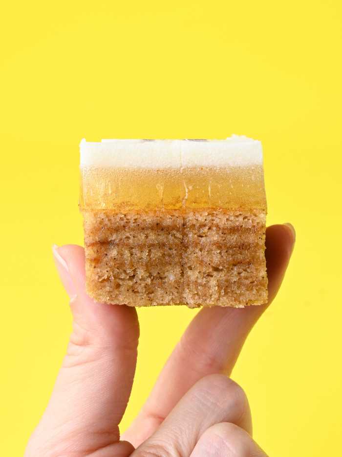 紅茶味のバウムクーヘンに、ぷるぷるのレモンゼリー、さらにふわふわの白生地を重ねた三層仕立て。