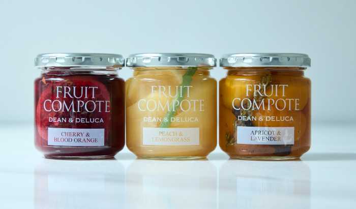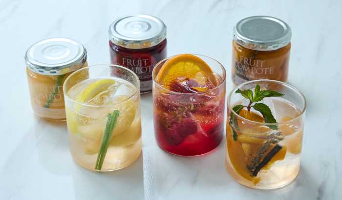 チェリー&ブラッドオレンジやピーチ&レモングラスなど、大人の味わいが楽しめるコンポートは炭酸水で割ってドリンクにも。