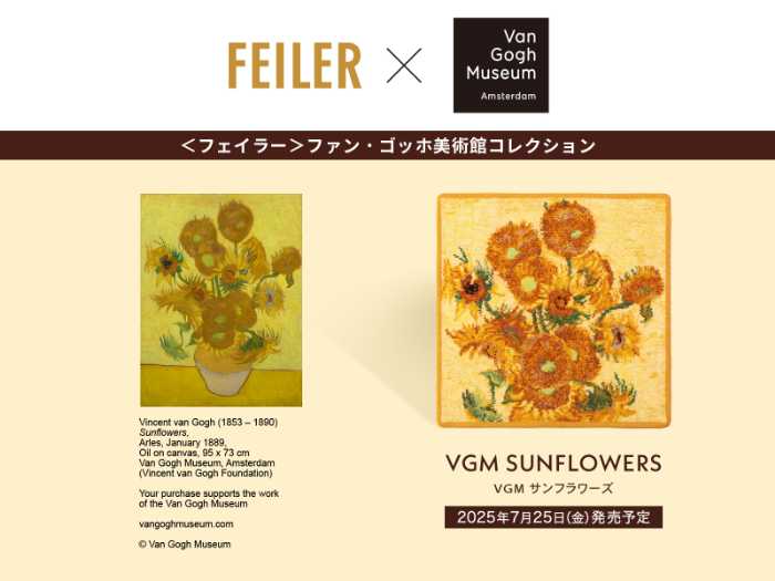 フィンセント・ファン・ゴッホの名作が、フェイラーの上質なシェニール織で日常に舞い降ります。フェイラージャパンから登場する〈フェイラー×ファン・ゴッホ美術館コレクション〉は、「サンフラワーズ」や「アーモンドブロッサム」など、世界中で愛される名画を鮮やかに再現した限定シリーズ。アートとクラフトが融合したこの特別なハンカチは、使うたびに心が華やぐミニチュアアートのような逸品です。