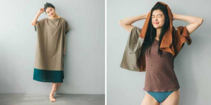 お風呂上がりや汗ばむ季節に便利な「着るバスタオル」もハンサムなバイカラーデザインで登場。軽やかなダブルガーゼ素材で、サッとかぶるだけで全身を包んでくれます。