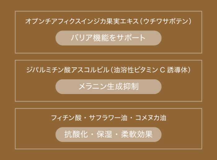 主成分にはサフラワー油、コメヌカ油、ホホバ油、カニナバラ果実油などを厳選配合。それぞれが保湿、柔軟、再生、抗酸化と異なるアプローチで、肌を土台から整えます。