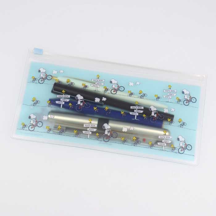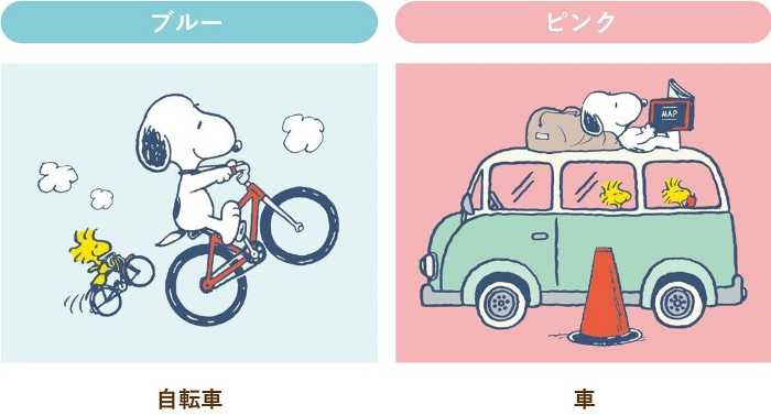自転車・車・スケボー・アイスなど、夏を楽しむスヌーピーの姿をモチーフにしたブルー・ピンク・イエロー・グリーンの4色展開で、使うたび気分が上がります。