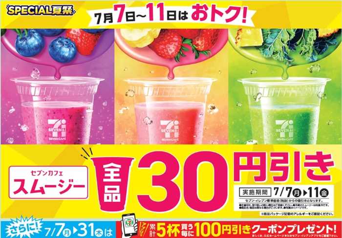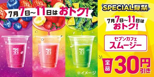 7月7日(月)〜11日(金)の5日間、「セブンカフェ スムージー」全品が30円引きに!対象は全国のセブン‐イレブンのスムージー取扱店舗で、専用マシンでつくるできたての美味しさが気軽に楽しめます。