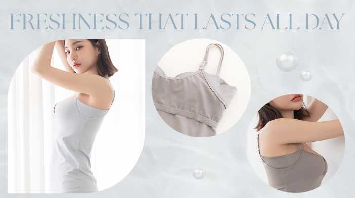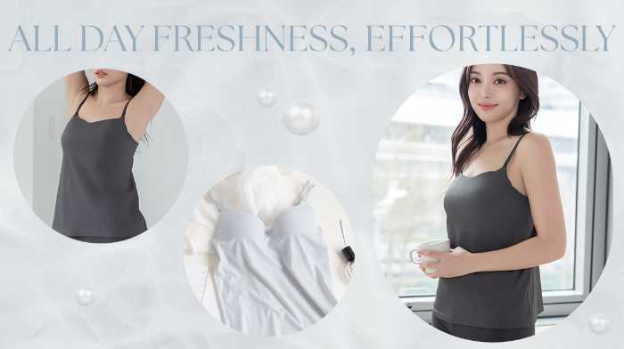 汗をかきやすい夏の日には、通気性と消臭力を兼ね備えた《ブラモネ》2cup盛りキャミが大活躍。
