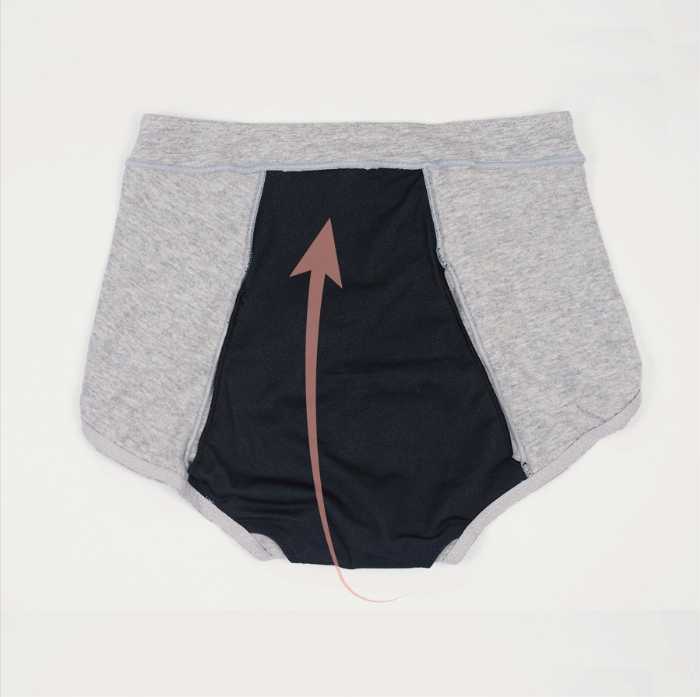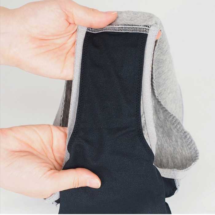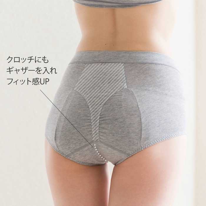 ナプキンのずれやよれが気になる…そんなお悩みをグラモアが解決。独自のV字ギャザーでヒップをしっかりホールドし、クロッチ部分のギャザーでナプキンをフィット。