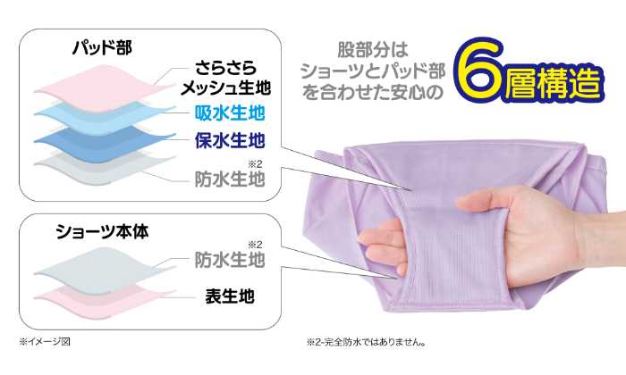 6層構造の吸水パッドがしっかりサポート。万が一のモレを防ぎつつ、ふらし仕様でズレにくく、布ナプキンなどの併用にもぴったりです。