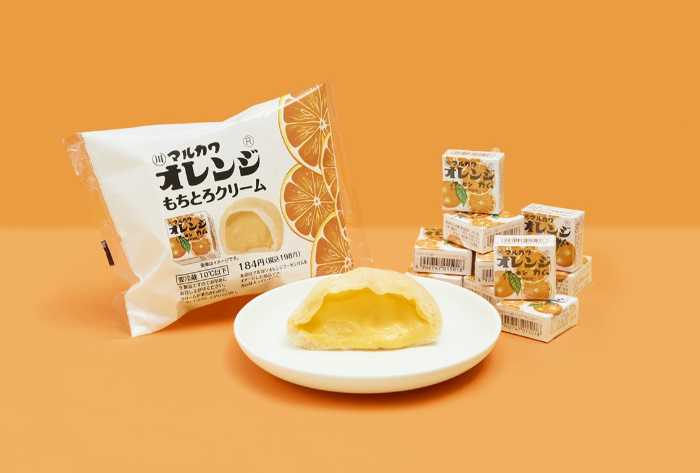 もうひとつは「マルカワオレンジフーセンガム」をイメージした「マルカワオレンジもちとろクリーム」。もちもち食感のやわらかい生地の中に、オレンジ風味のクリームがとろり♡