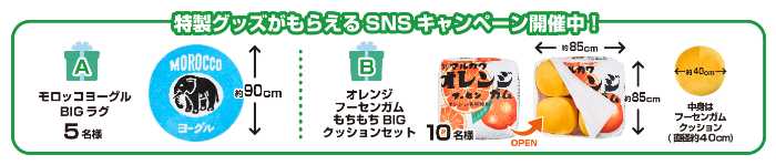 抽選で「モロッコヨーグルBIGラグ」や「オレンジフーセンガムもちもちクッションセット」が当たるチャンスも。