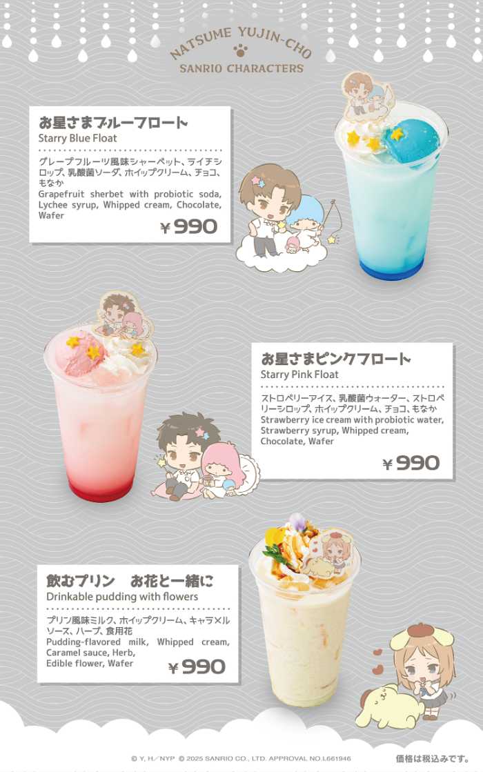 今回のコラボカフェでは、夏目友人帳のキャラクターとサンリオキャラクターズがペアになった可愛いオリジナルメニューが登場。