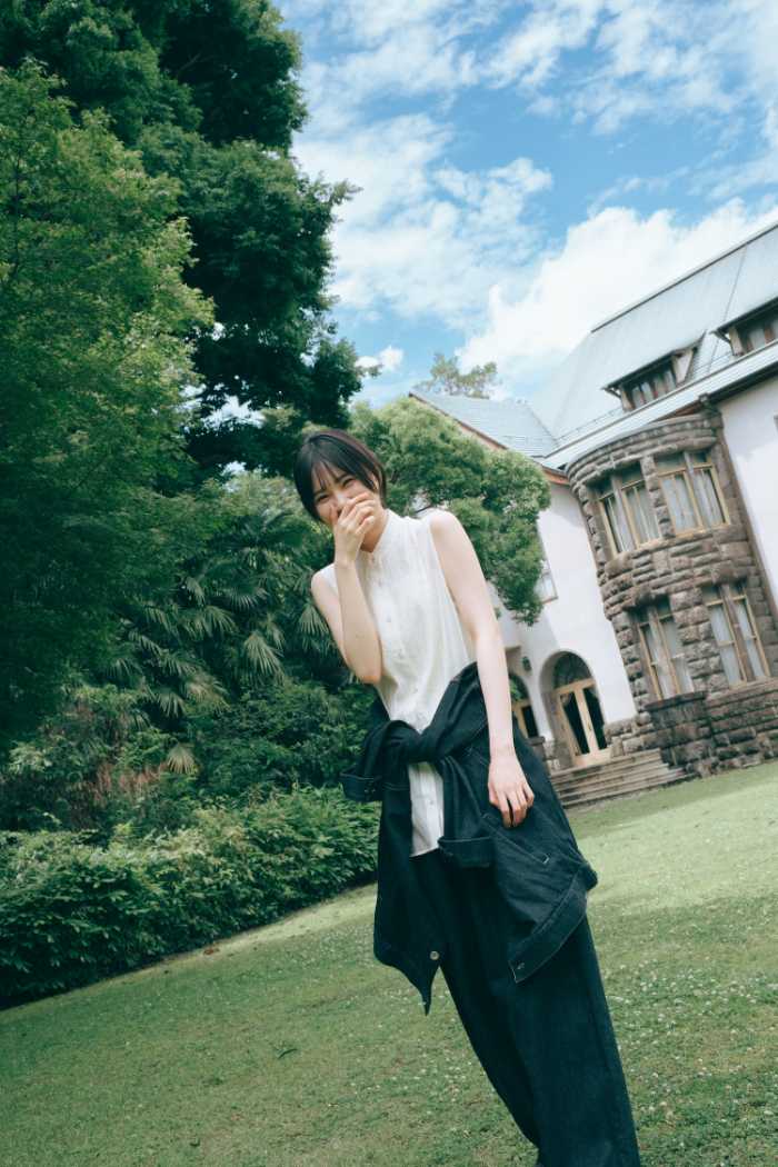 緑に囲まれた洋館で撮影された写真は、静謐な空気感とともに、彼女の“芯の強さ”を映し出します。自然にこぼれる笑顔や真っ直ぐな視線は、まさに今を生きる女性像そのもの。