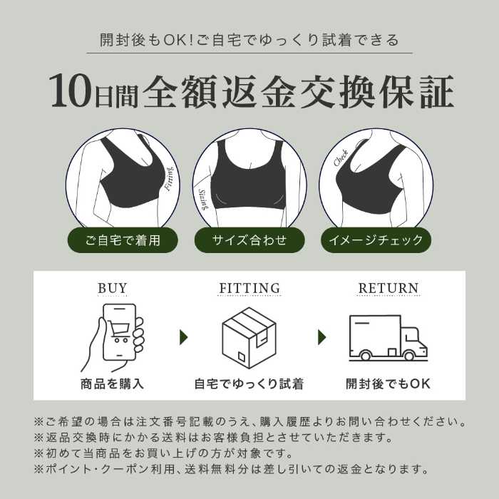 「ナイトブラ、気になるけど自分に合うか心配…」という方にこそおすすめしたいのが、E.meの安心制度。なんと開封後でもOKな10日間の全額返金・交換保証付き!