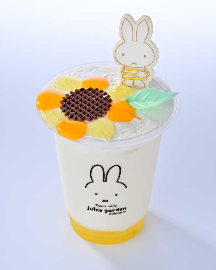 「フラワーミッフィー ひまわりヨーグルトドリンク」は、レモンヨーグルトベースに、鮮やかなオレンジ&レモンソースでひまわりの花びらを表現した夏限定ドリンク。