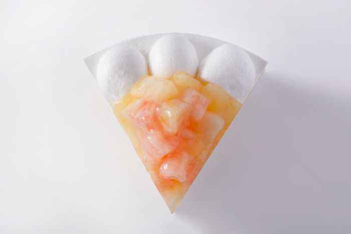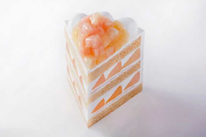 果汁がじゅわっと広がるみずみずしい桃と、しっとりやわらかなスポンジ、そして口どけのよい生クリームが奏でる、三重奏のような味わいをご堪能あれ。