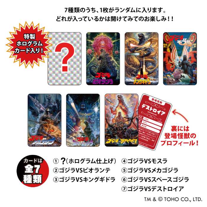 箱の中には、平成・VSゴジラシリーズのオリジナルカード(全7種)をランダムで1枚封入。